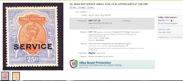 India 25 Rupees King George V stamp with overprint SERVICE, sold for $222.